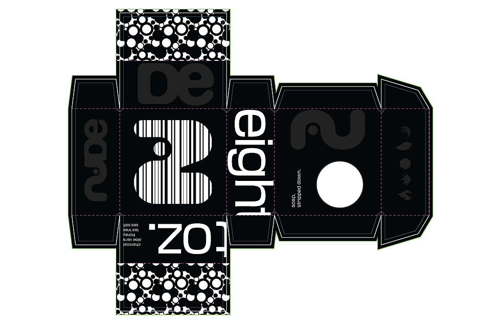 I developed the branding and packaging for NUDE, an artisanal handcrafted soap line targeting millennial, eco-conscious men redefining modern masculinity. NUDE's tagline, “Soap, stripped down,” reflects its minimalist ethos and dedication to sustainability. With only five all-natural and organic ingredients—honey, charcoal, sea salt, tea tree oil, and aloe vera—NUDE offers raw, honest care for both skin and the planet. The packaging design embraces a bold, modern aesthetic with an emphasis on simplicity and visual intrigue. The typography takes center stage, featuring a custom treatment of the wordmark "nude." The black-on-black palette creates a striking contrast that reinforces the stripped-down concept, while dynamic patterns of circles add texture and depth. These graphic elements evoke natural motifs, balancing structure with organic fluidity. Essential product information, including ingredients and weight, is displayed in a clean, minimalist layout to maintain readability and highlight the soap’s purity.