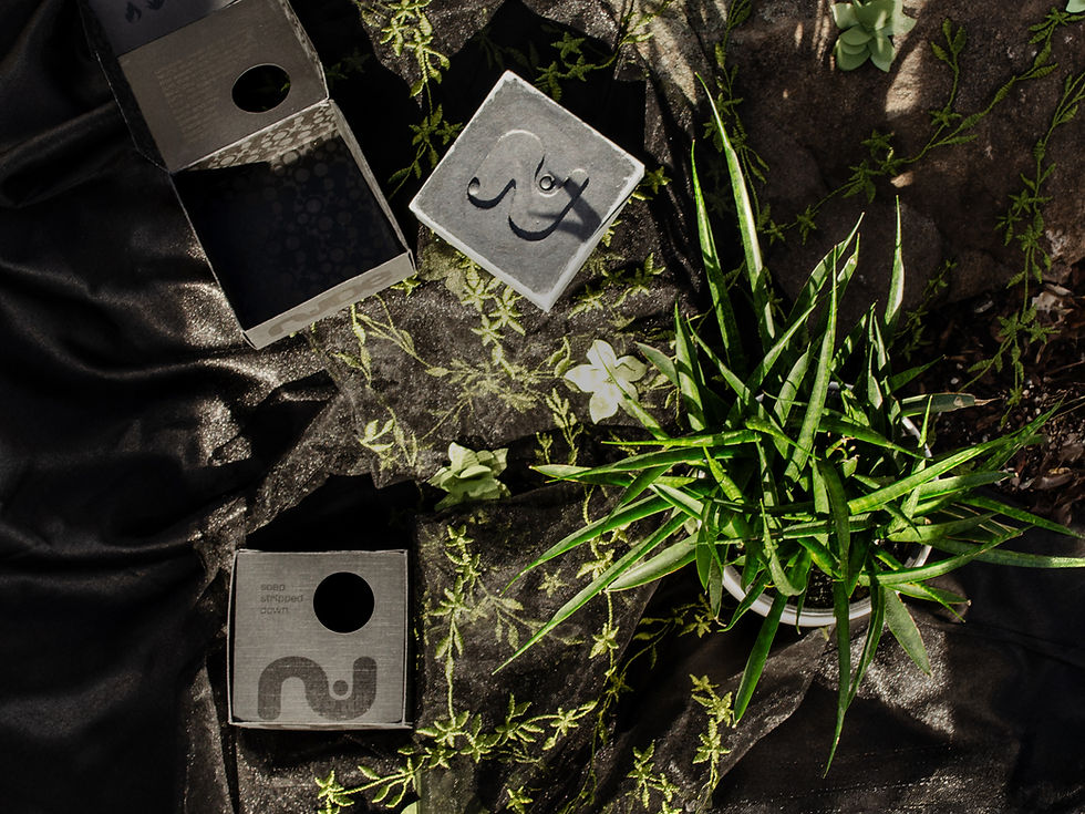 With the logo and letterform finalized, I transitioned to designing the packaging. I began by creating a die-line template in Illustrator, which served as the foundation for exploring various layouts and color schemes. My primary focus was on ensuring the design seamlessly wrapped around the packaging, encouraging users to engage with and spend time interacting with the box. I experimented with placing the logo across multiple planes and thoughtfully considered the placement of the die-cut to enhance the overall user experience. Ultimately, I chose the first option because I was excited to explore the possibilities of printing black ink on black paper.